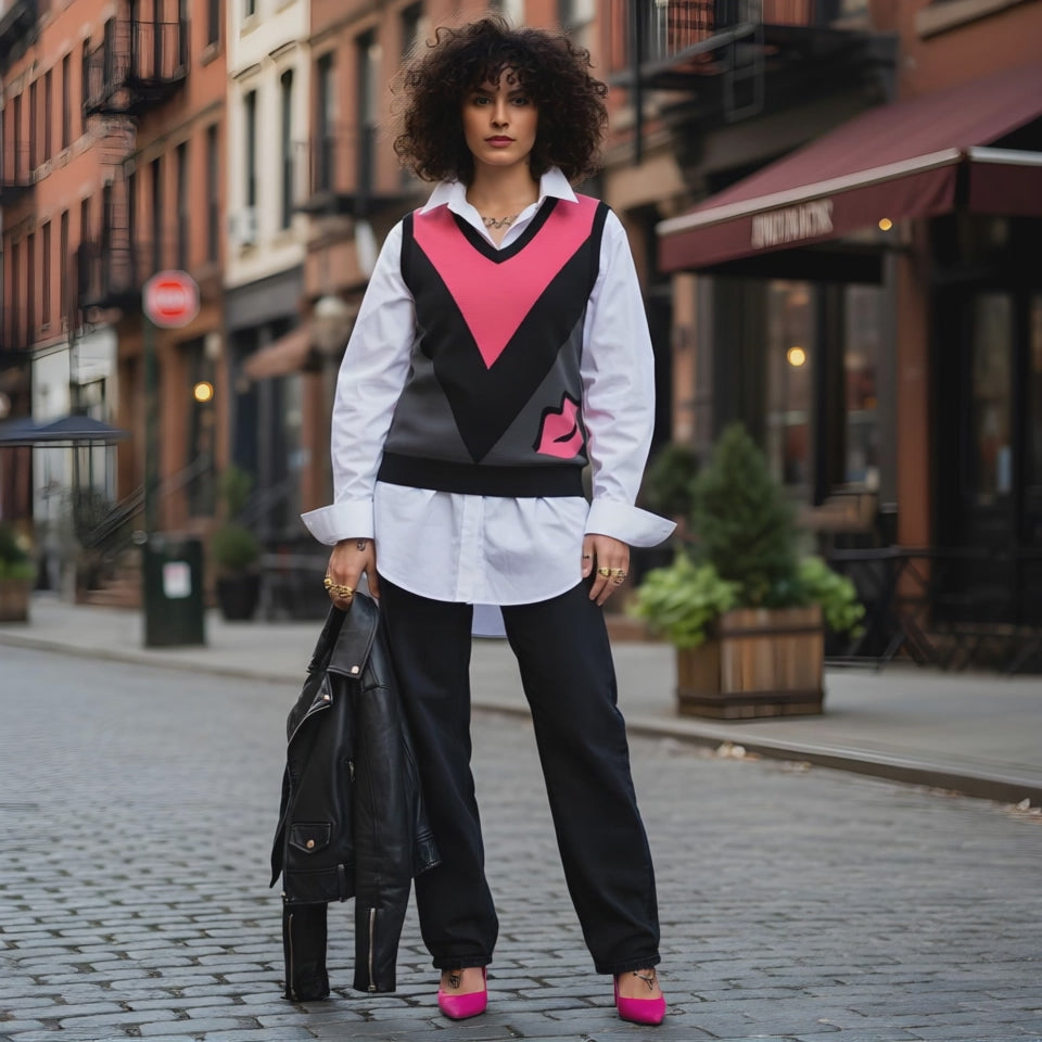 This is the classic knit vest, but with way more attitude. Featuring a bold retro V-print and kissably pink lip graphic, it’s giving preppy but problematic, soft but savage. The jacquard knit brings luxe texture, while the V-neck cut keeps it effortlessly layered over tees, collared shirts, or just your bare chest and good decisions (optional).